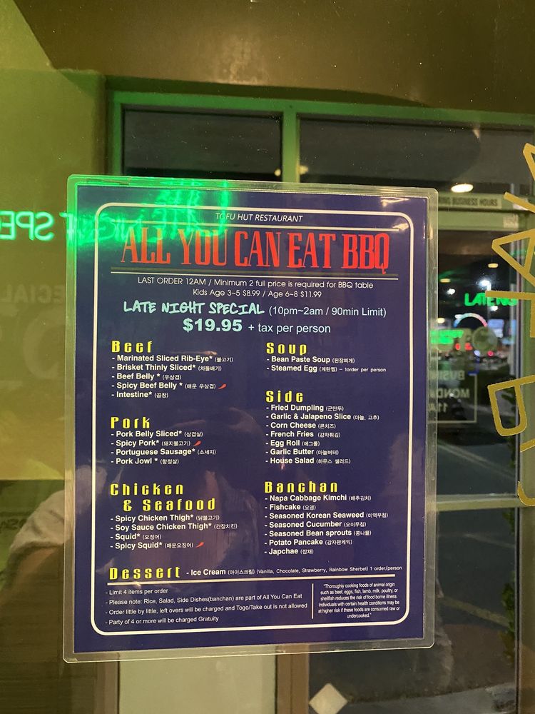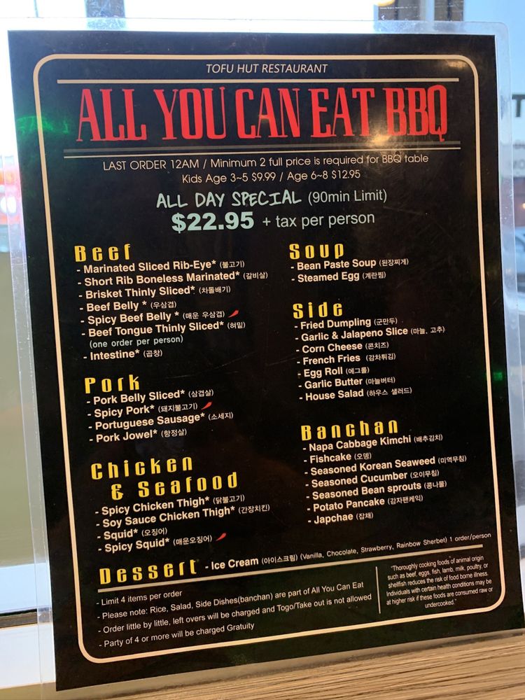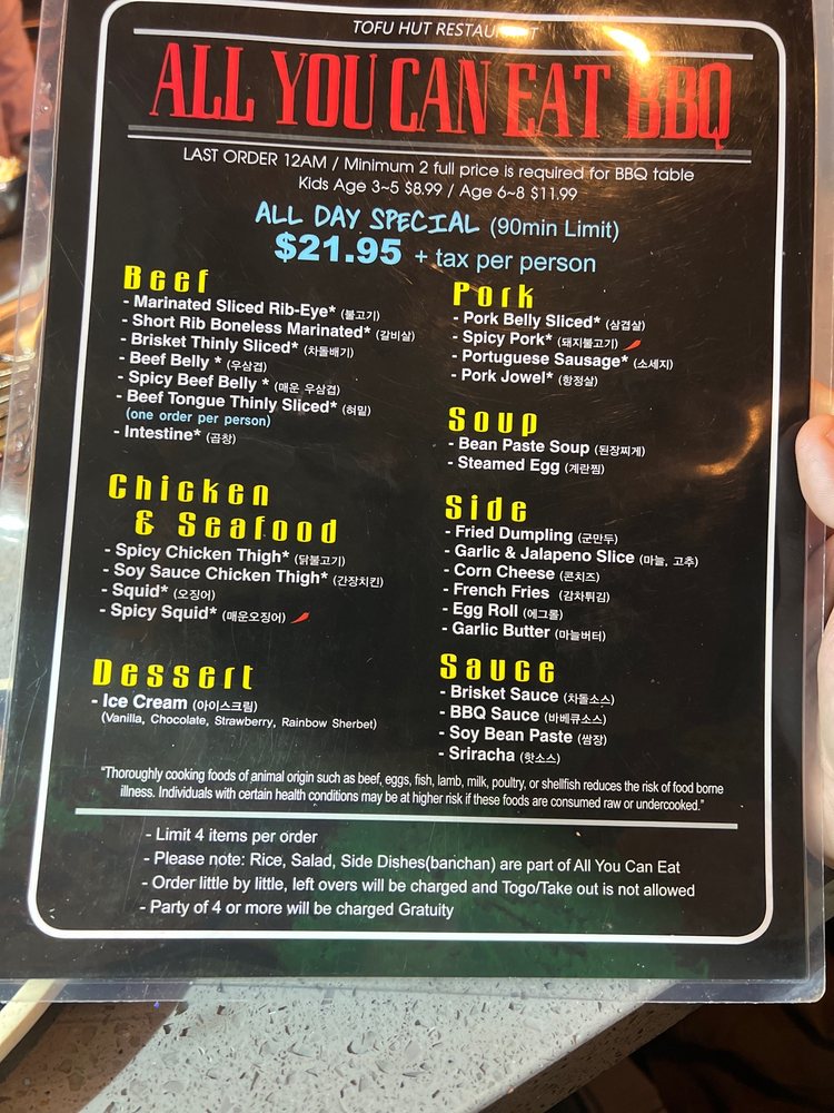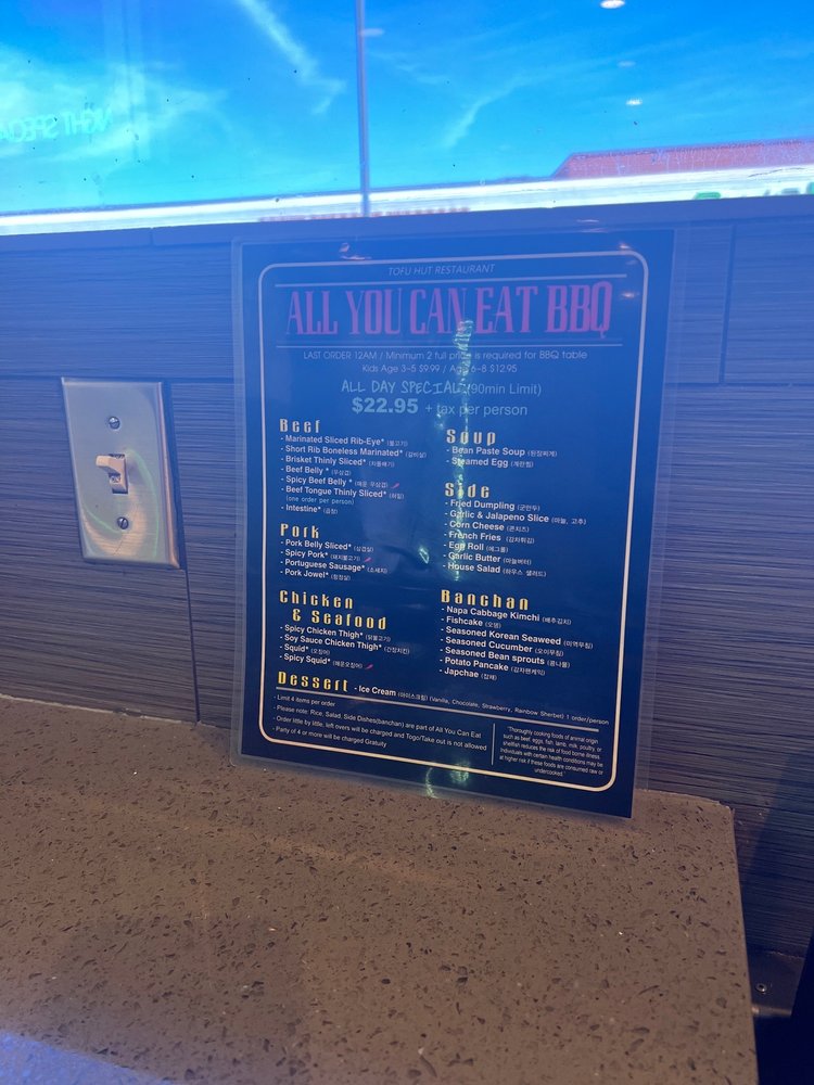 Introducing the menu at Tofu Hut, a Korean BBQ spot in Las Vegas, offering a variety of options for lunch and dinner. Their lunch specials include Spicy Shredded Beef Soup and Beanpaste Pot Stew, while their House Specials feature Short Ribs BBQ and Spicy Chicken. Additionally, they offer Stir Fried Squid and Stir Fried Octopus as part of their menu. Customers praise the quality of the meat and the affordability of the dishes. The atmosphere is described as welcoming, with efficient service. Tofu Hut is known for its all-you-can-eat BBQ options at a great price, making it a popular choice among locals and visitors alike. With a focus on providing a satisfying dining experience, Tofu Hut ensures that guests leave happy and satisfied with their meal.